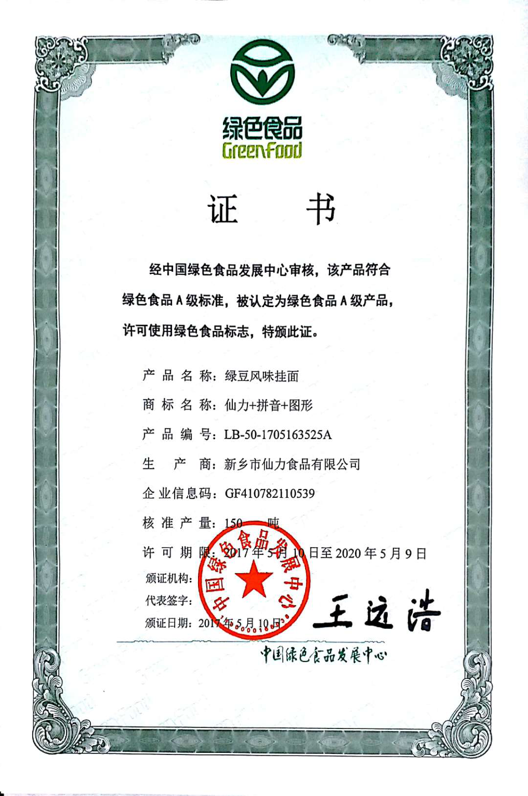綠色風味掛面-綠色食品證書